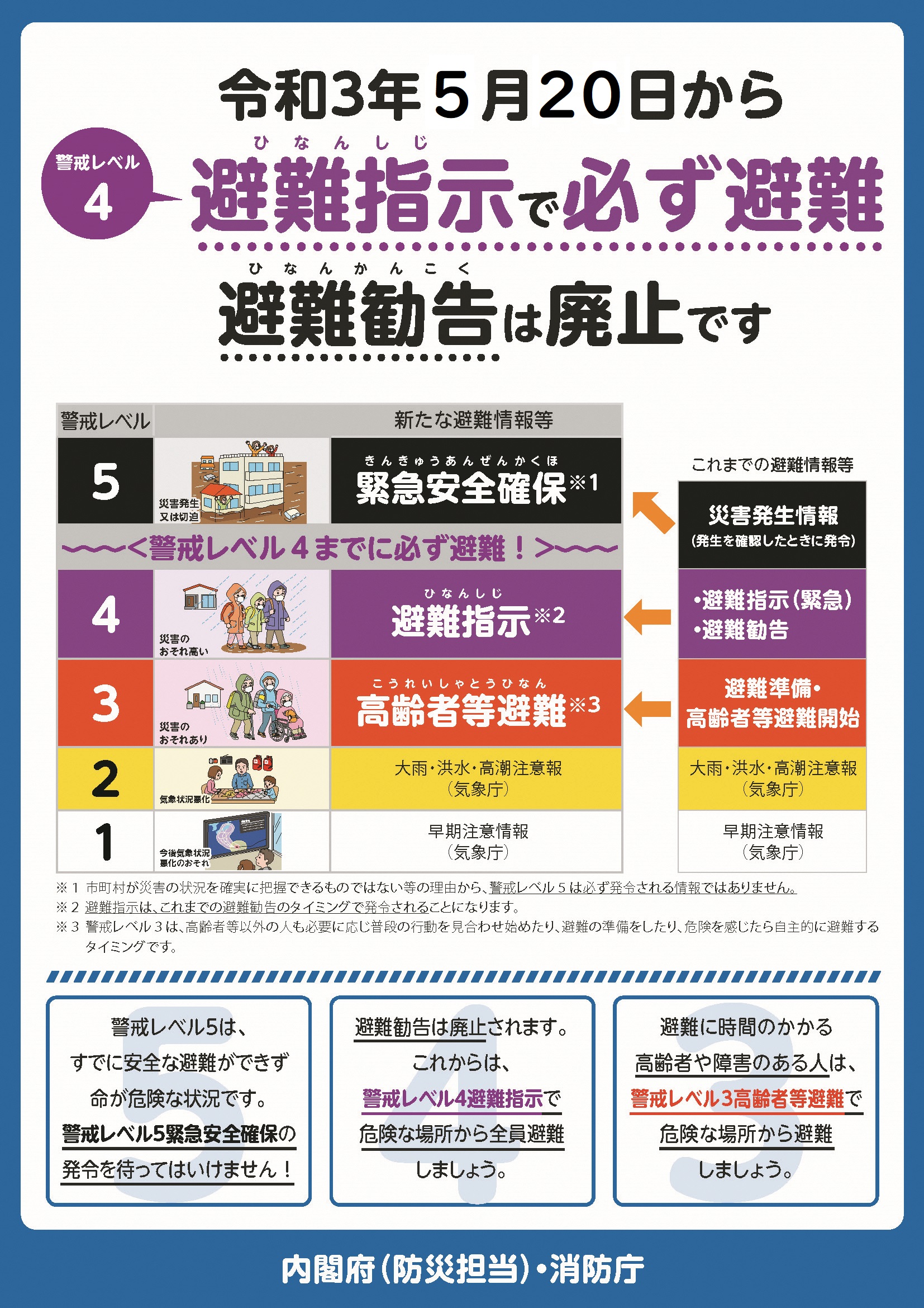 大雨などによる災害時に市区町村が発令する「避難勧告」を廃止し、「避難指示」に一本化するなど、新たな避難情報の運用が令和3年5月20日から始まります。 詳細は別添ファイルをご覧ください。