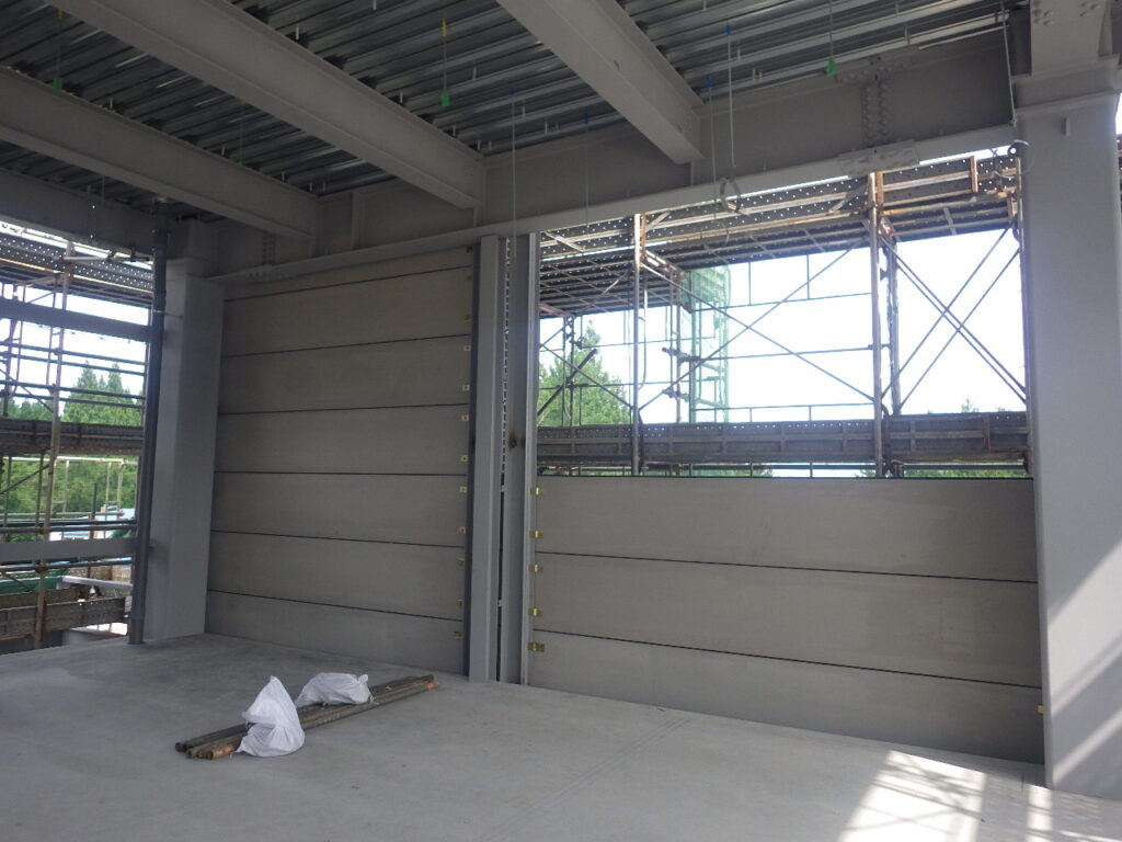 外壁工事が始まり、現在北・東面の外壁張り作業を行っています。