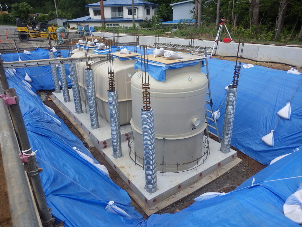 底盤コンクリートの打設をし、浄化槽設置が完了しました。