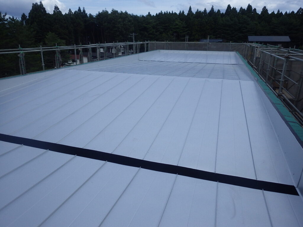 屋根では、合板が張り終わり屋根葺き作業が完了しました。