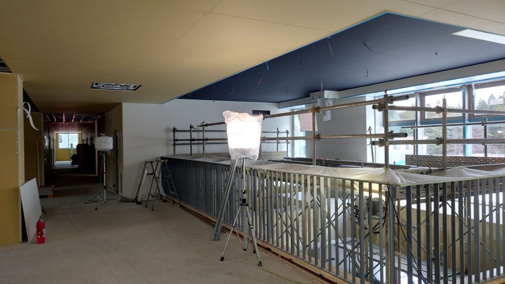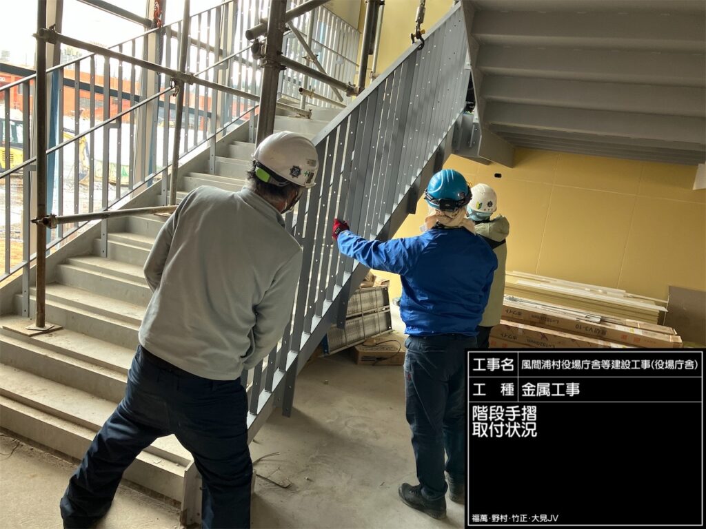 階段手摺下地取付:村⺠ホールの吹き抜け部分に鉄製の手摺下地を取付けます。