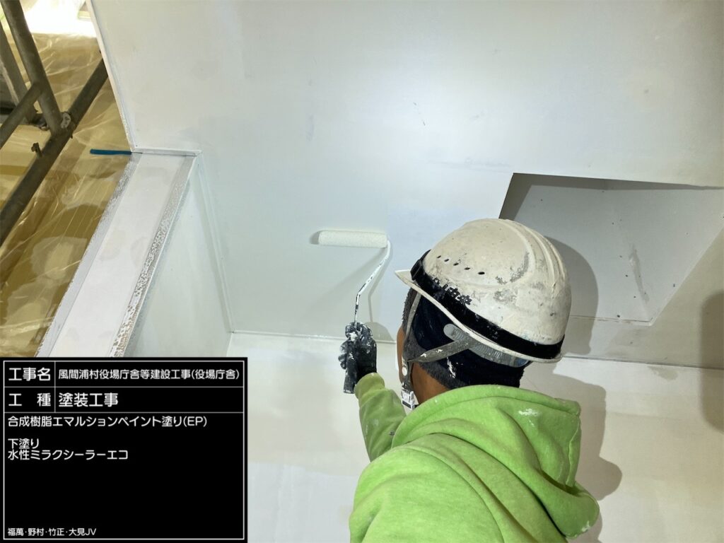 壁・天井塗装:ローラーや刷毛を使用して、ムラが出ないように塗装します。