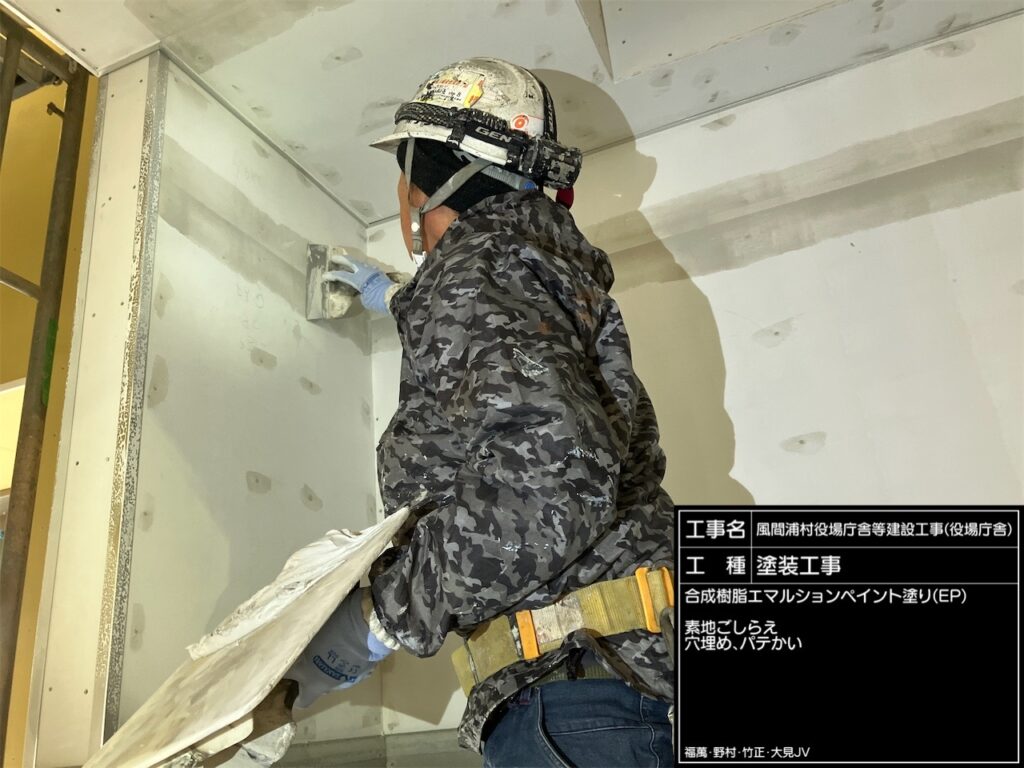 壁・天井塗装(パテかい):塗装の前工程で、ビス穴やボードの継目に下地ごしらえとしてのパテを施工して段差を無くします。