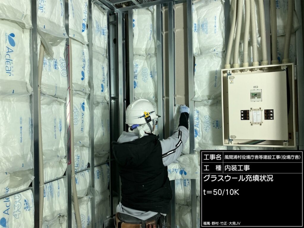 壁内グラスウール充填:壁の断熱と遮音用に内部にグラスウールを充填します。