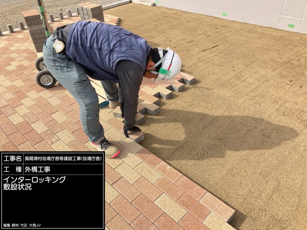 庁舎外部に、インターロッキングブロックを敷設します。