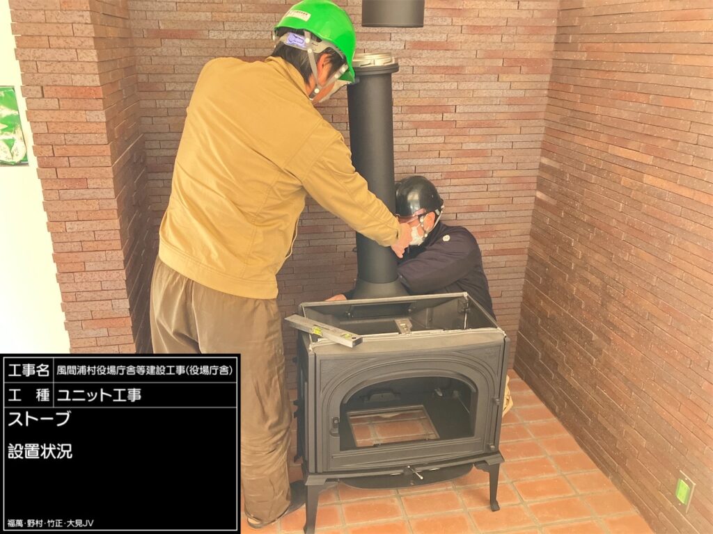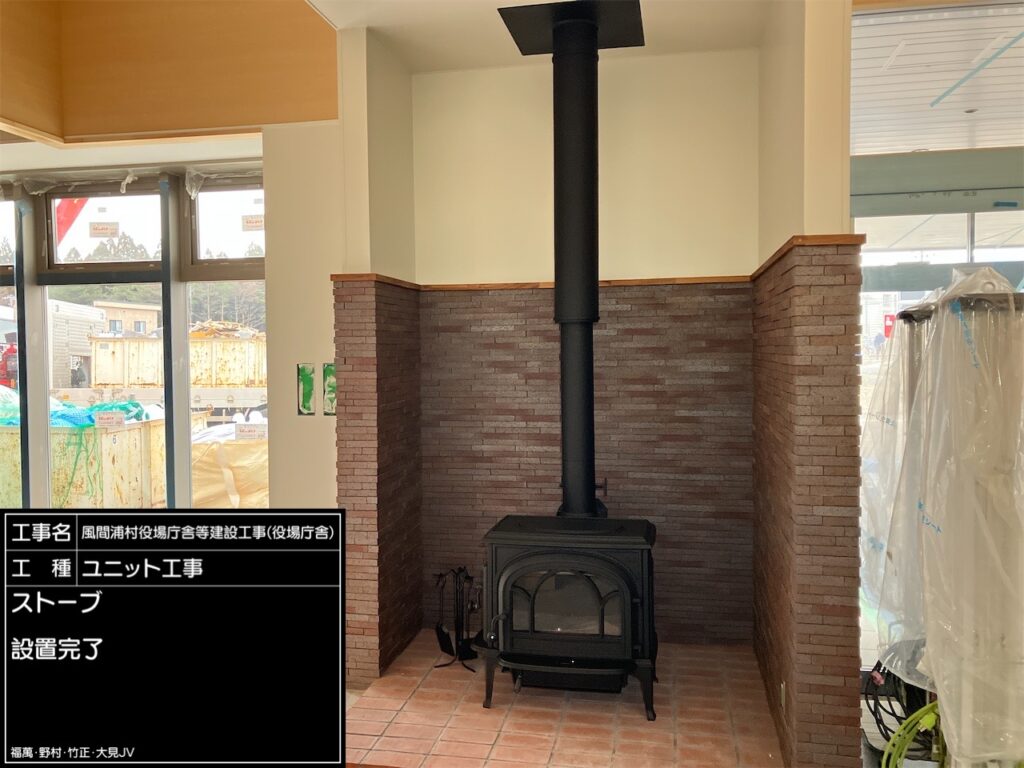 村⺠ホールの⼀部に、薪ストーブを設置します。