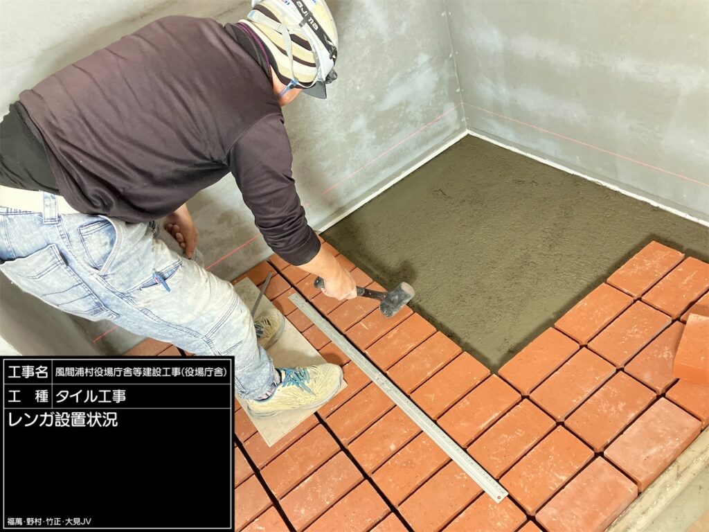 村⺠ホールに設置される薪ストーブの廻りの壁にボーダータイルを張ります。