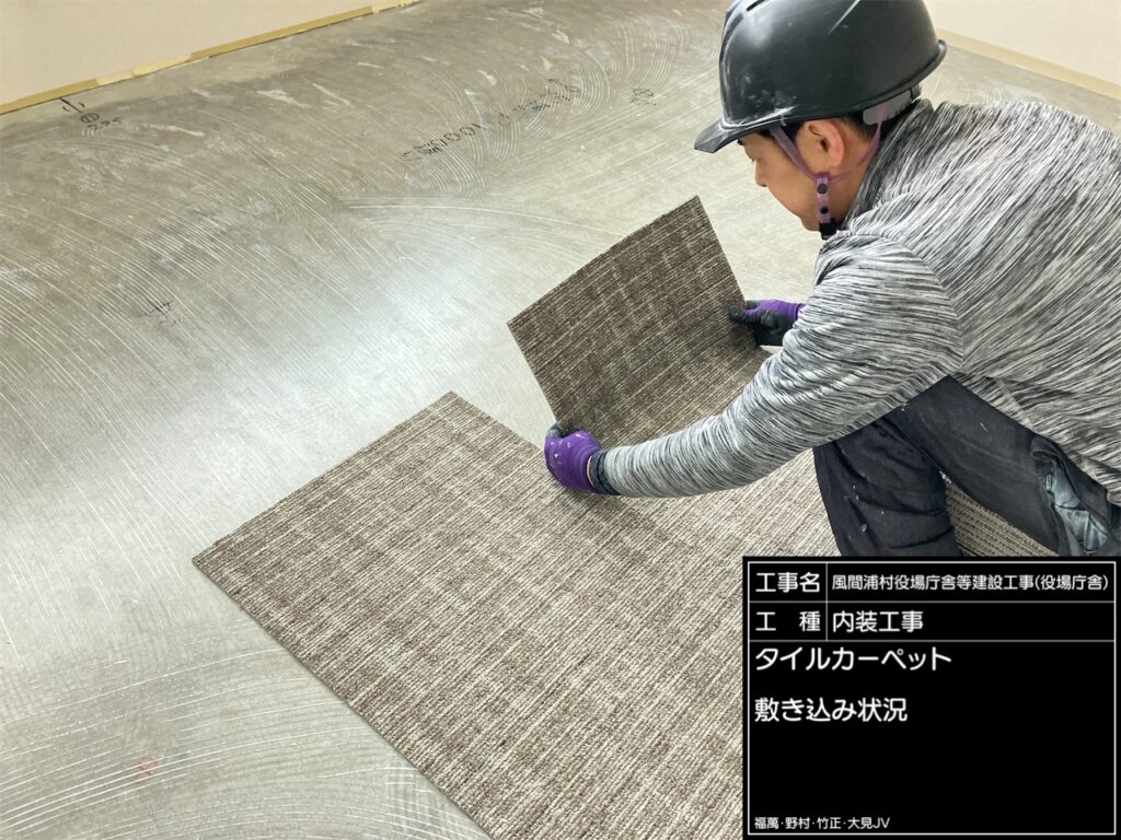 床の仕上となるタイルカーペットを敷き込みます。